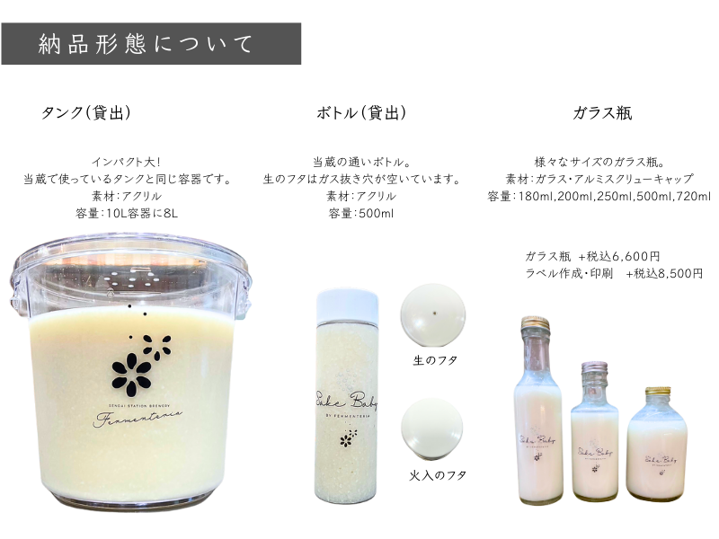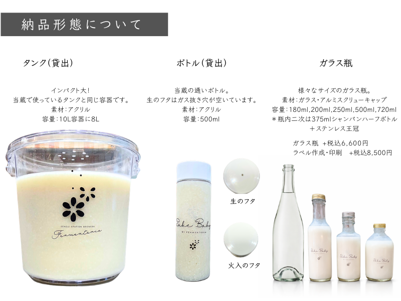 当蔵のタンクと同形状の容器やボトル(貸出)をご用意しております。オリジナルラベルを貼ったボトルでの納品も可能です。