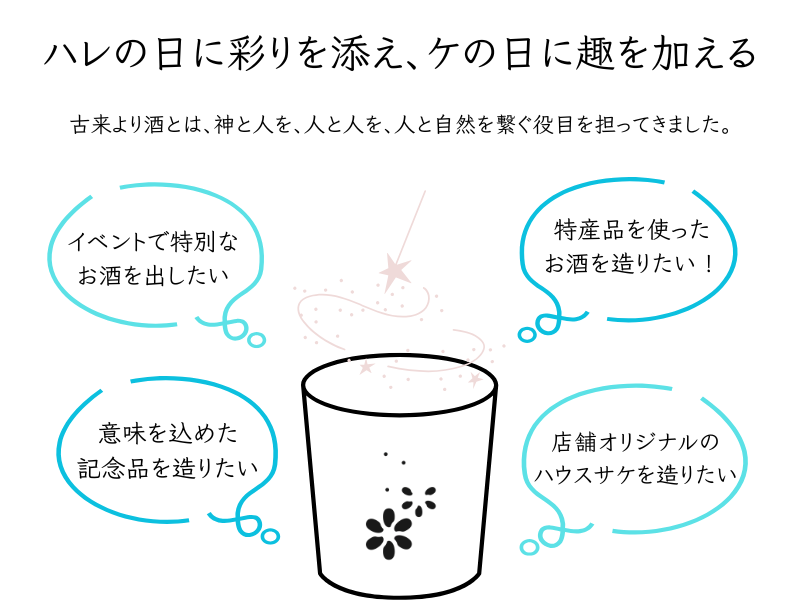 地元の特産品を使った新商品の開発や、店舗オリジナルのプライベートブランド酒の製造など、アイデア次第で幅広くご利用いただけます。